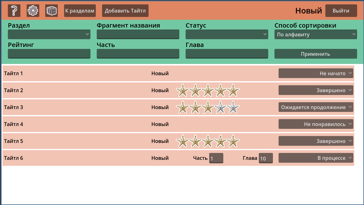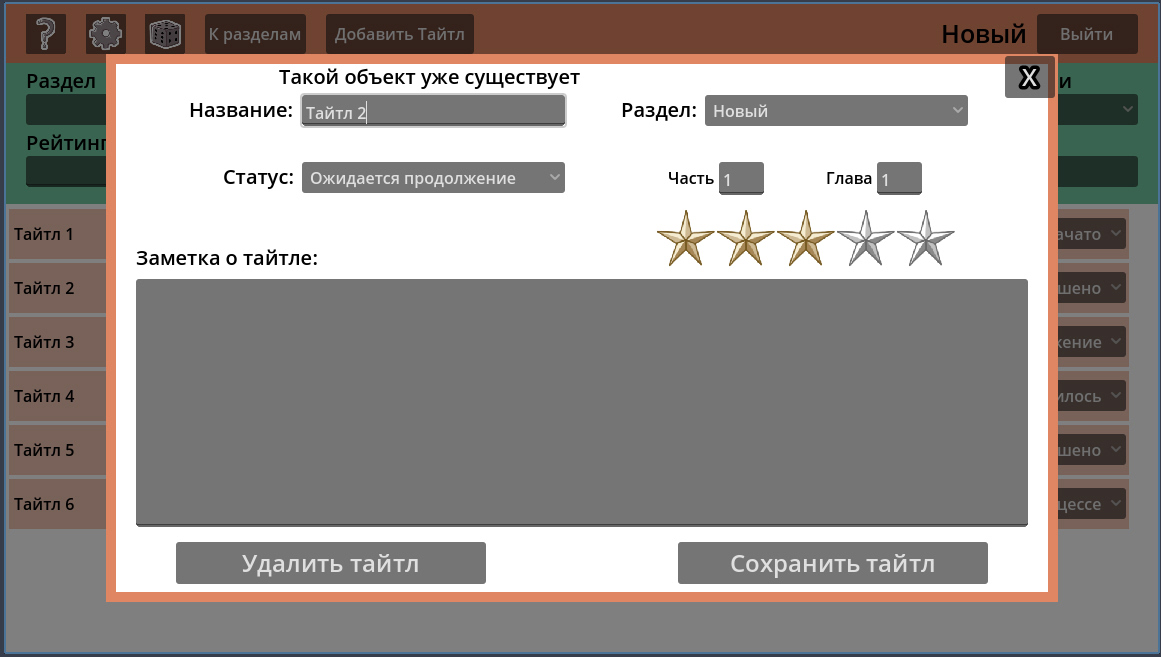 Это приложение, которое позволяет вести записи о просмотренных фильмах и сериалах, прочитанных книгах и комиксах и т.д. С его помощью вы можете сохранять информацию о каждом произведении, отмечать текущий прогресс в чтении / просмотре, ставить оценки, добавлять заметки о тайтле. Организуйте свою коллекцию, отслеживайте прогресс и возвращайтесь к любимым фильмам и просмотрам в любое время. Простое управление и возможность сортировки делают ваше хранилище информации максимально удобным и персонализированным.