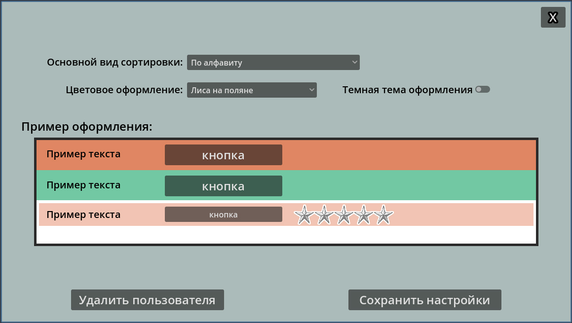 - 22 варианта цветового оформления, также присутствует темная тема оформления
